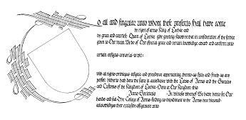 This AoA blank was designed by Master Frae Fitzalleyne in the style of a document from the early 16th century, based on several contemporary documents including Cardinal Wolsley's letter of Credence (1527), The Treaty of Windsor (1532) and the Election of Francois I to the Order of the Garter (1527).