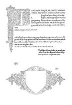 This award blank used in Lochac was designed by Mistress Caitlin de Courcy and Mistress Rowan Perigrynne. The text and the illumination are to be found in many books of the late 14th to 15th centuries and the design is almost particularly of Italian origin. Examples of the style are easily found in period pieces from Florence, Venice, Rome, Naples and to some extent Spain - all magnificent centres of culture and art during the Renaissance. I would place this particular rendition as Napolitan around the late 15th century.