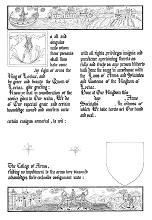 This blank was designed by Mistress Caitlin de Courcy in the style of a Durer Woddcut. It was originally intended that the woodcuts not be coloured at all, and for the device alone to be illuminated, and perhaps the text rubricated.