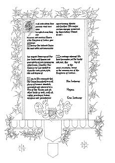 This scroll should be completely like the vine leaf AoA and should have Baronial devices or bunting of your choice in the smallest shields. The lowest shield should contain the Lochac device.