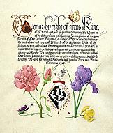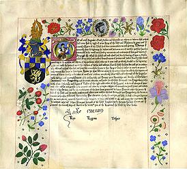 Grant of Arms for Lord Charles du Bois Caristiona nic Beathain Design and illumination inspired by the Mira Monumenta Calligraphiae, the last great manuscript produced in Europe for the Emperor Rudolf II, written in 1562 and illuminated in the 1590's. The Mira's illumination programme consisted of extremely naturalistic and illusionistic flowers, animals and insects; shown here are scarlet gillyflowers surrounding the recipient's arms, a common fly and a garden snail. |