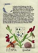 Grant of Arms for Mistress Isabeau of the Wilde Woode Giles de Laval This scroll is based on early 16th century German documents such as the Prayerbook of the Emperor Maximilian (1514) and Cardinal Wolsey's Letters of Credence (1527).The scroll features an intricate Cadel style capital with delicate pen-drawn filigree, German Fraktur script and the recipient's Arms. |