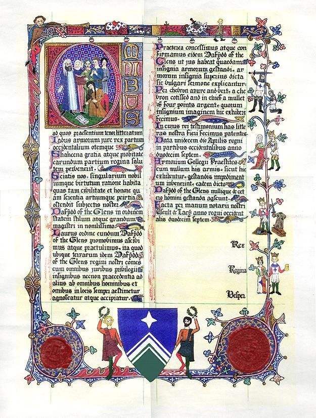 Patent of Arms (Order of the Laurel) for Master Dafydd of the Glens |