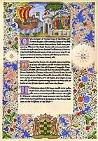 Royal Patent of Arms for Duchess Juana Isabella de Montoya y Ramirez (You Killed My Father, Prepare to Die) Nerissa de Saye, Inspired by late 15th century Spanish manuscripts. The miniature illumination shows the recipient embarking on her new estate as a Duchess, symbolised by setting sail in a ship (view detail). |