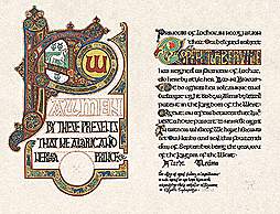 Royal Patent of Arms for Viscountess Elspeth of Turberville Nerissa de Saye This work is based on the Book of Kells and the Lindisfarne Gospels (8th century). The intricate illumination includes anthropomorphic and zoomorphic forms, as well as celtic interlace and geometric patterns, and incorporates the recipient's arms into the capital (view details of the illumination and the capital). |