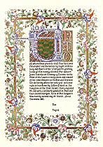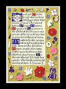 Patent of Arms (Order of the Pelican) for Mistress Filippa Ginevra Francesca di Lucignano Giles de Laval This manuscript is based on several early 16th century Flemish books of hours, in particular the Sloane and Hastings Hours. The text was written with quill. The border design is typical of the Ghent-Bruges school of illumination, depicting illusionistic, highly natural flowers and insects strewn on a luminous liquid gold background. Many of the flowers carry symbolic meaning, including the lily for purity, heartsease for devotion, speedwell for success, pinks for sacrifice and strawberry for good works. The recipient's arms are painted in the capital only 11mm high; the entire scroll measures only 15 x 10.5 cm. |