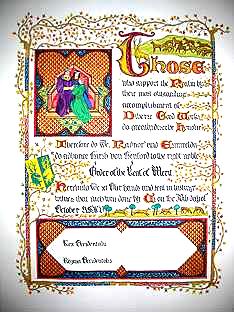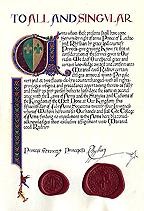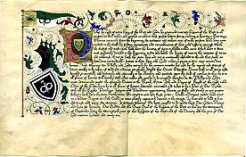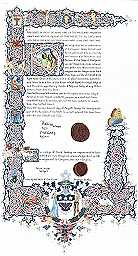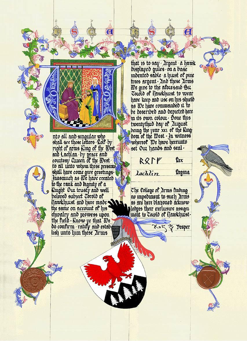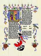 Patent of Arms (Knight) for Sir Torold of Hawkhurst Rowan Perigrynne Based on late 14th century Bohemian manuscripts such as the Golden Bull and the Wenceslas Bible. The historiated capital depicts the recipient swearing fealty to the King (view detail) and the form and delicate colouring of the foliage is peculiar to Eastern European manuscripts of this time. |
