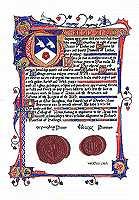 Patent of Arms (Order of the Pelican) for Mistress Eleanor of Caithness Giles de Laval Design and illumination inspired by the Mira Monumenta Calligraphiae (view details). |