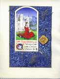 Patent of Arms (Knight) for Sir Inigo Missaglia Rohesia le Sarjent A magnificent manuscript in the international gothic style, based on the Bible Historiale, c. 1357. For a step-by-step progression of this scroll, click here. The miniature shows the story of St George: top left, the dragon ravages the country and eats all the sheep. Top right, the people draw lots to decide who will be fed to the dragon, and the Princess is about to draw the short straw. Centre, St George comes to the rescue. Bottom left, the subdued dragon is led into the city, and finally bottom right, St George slays the dragon and inspired by his courage the people become Christians. The border miniatures illustrate the seven knightly virtues. Clockwise from the left: measure, justice, courage, humility, loyalty, courtesy and magnanimity. Naturalistic grisaille portraits of the King and Queen of Caid flank the recipient's arms. The scroll was written with Chinese ink and illuminated with gold leaf, gold powder and period pigments on goat vellum. Red tones are made from brazilwood and dragon's blood, flesh tones are red ochre and zinc oxide with some egg shell. Blues are lapis lazuli, some with a little black nightshade juice. Greens are Malachite or veridigris, and some parsley juice. Yellow is made from saffron, white from zinc oxide. Paints were prepared by hand by the scribe, bound with gum acacia or glair; the raised gold work is laid on gesso. |