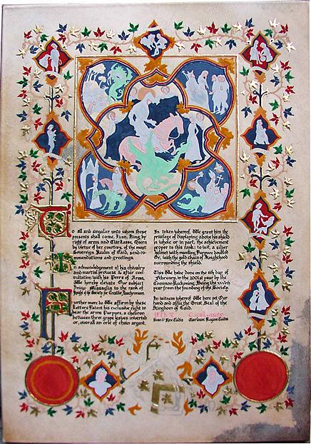 This page shows the main stages in execution of a large scroll (60cm x 24, approximately A2) on goat parchment, with gilding on plaster-based gesso. Before any of the actual work begins on the scroll itself, there are many hours of research involved. The time-period for the scroll must be decided, and exemplars of the style studied. This scroll is based on the Bible Historiale, from around 1357, and is in the style known as "International Gothic." The design itself must then be worked out--not only the elements to include, but the overall layout. The design here is of St George slaying the dragon--a fitting knightly quest. The small miniatures represent the knighly virtues: measure, justice, courage, humility, loyalty, courtesy and magnanimity. The calligraphy must be written out (sometimes several times) until the scribe is sure it fits the space allotted (or the design adjusted until it fits the calligraphy, as appropriate). A full-size line drawing will be made on paper, any final adjustments and corrections made, and this design then transferred to the parchment itself. Parchment can be a tricky medium to work with; it is very sensitive to relative humidity and tends to buckle in unexpected places. It may need flattening several times under weights while it is being worked on, unless it is fastened firmly to a board. Care must be taken not to over-wet it, as this can raise a nap which is difficult to flatten out again. Finally, there are the ink and paints themselves. The scroll was written with Chinese ink and illuminated with gold leaf, gold powder and period pigments. Red tones are made from brazilwood and dragon's blood, flesh tones are red ochre and zinc oxide with some egg shell. Blues are lapis lazuli, some with a little black nightshade juice. Greens are Malachite or veridigris, and some parsley juice. Yellow is made from saffron, white from zinc oxide. These paints must prepared by hand, grinding them finely and binding them with gum arabic or glair. |